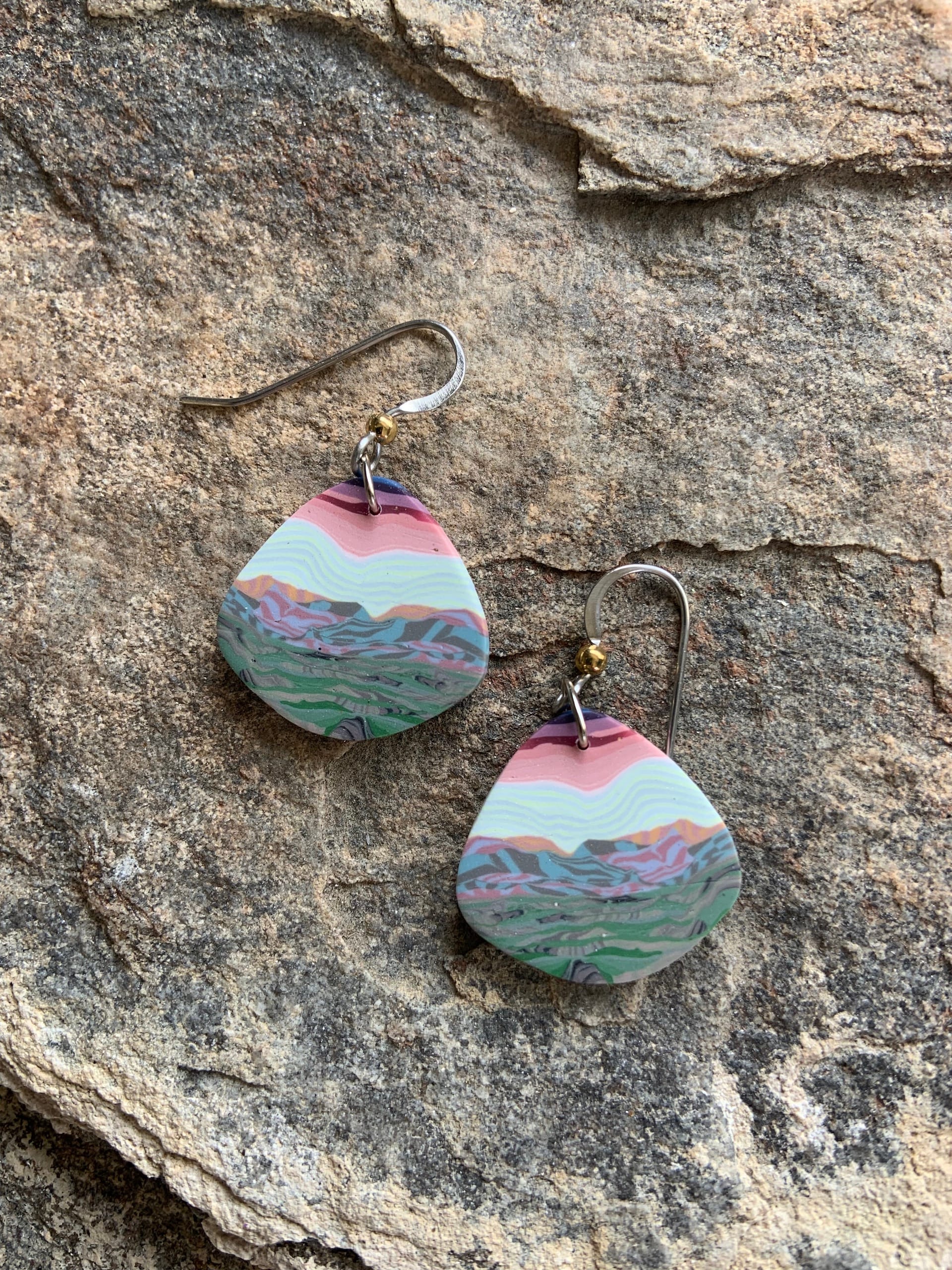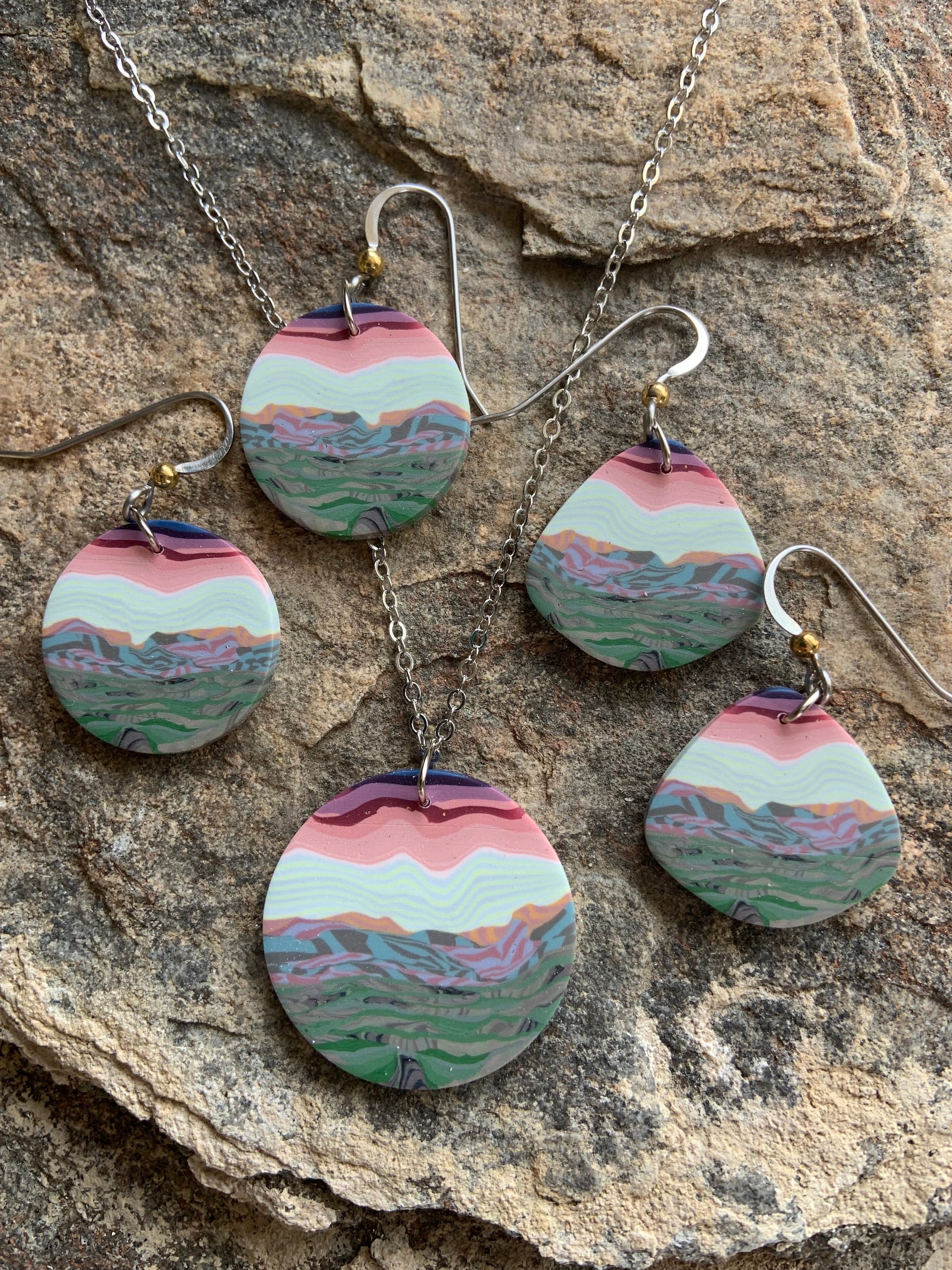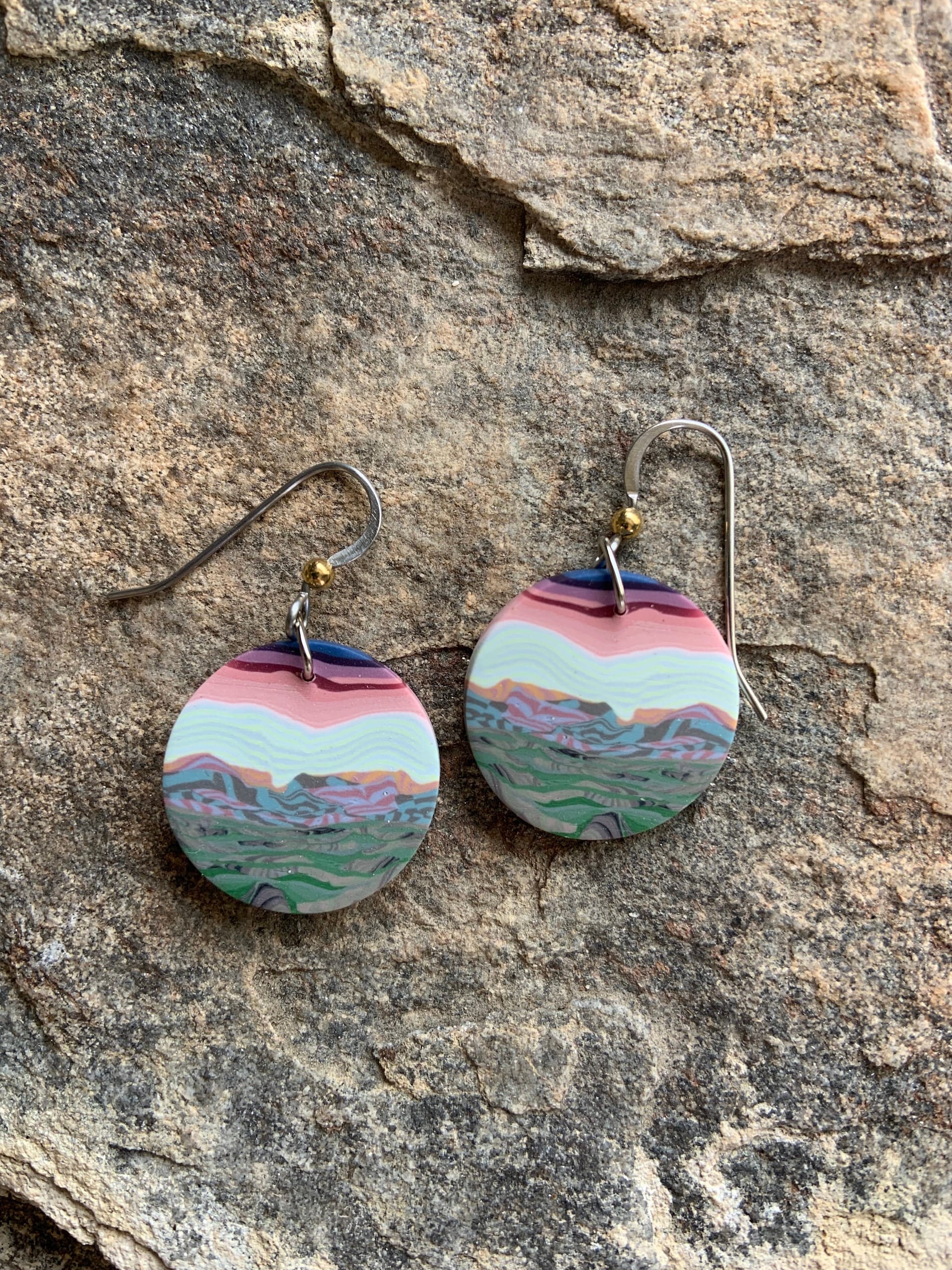 Each design of our polymer clay jewelry is created using a layering technique called canework.  This process involves working three-dimensionally to produce a small brick or "loaf" which is then sliced revealing the image in the cross-section.  Each slice is both an original and one of a series with variations that can differ slightly from the representative picture.  All work is completely hand done by us.