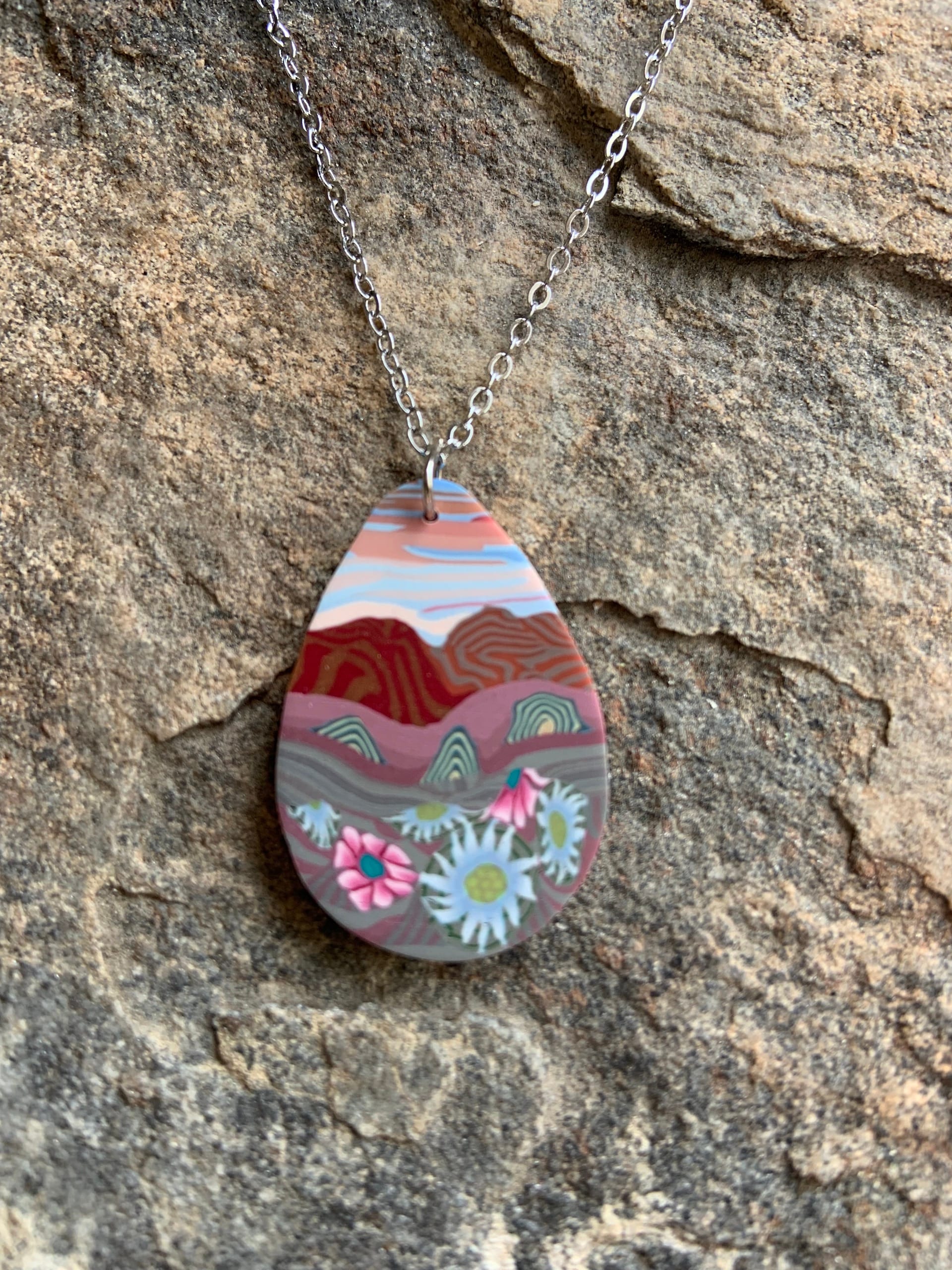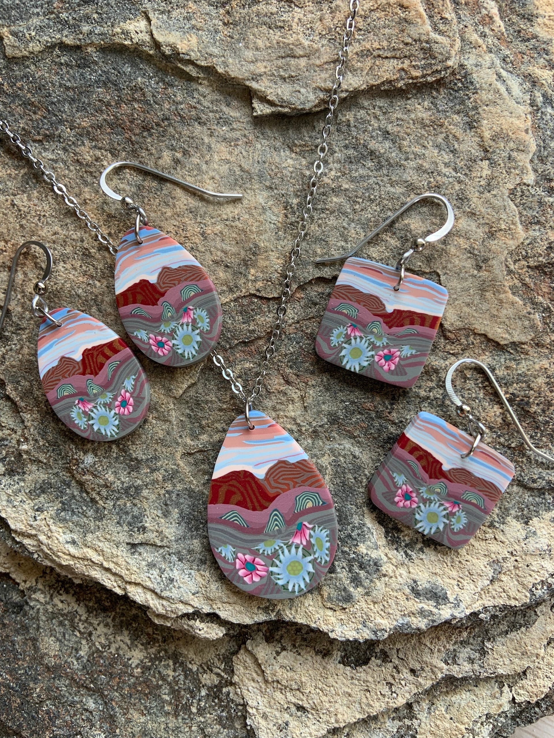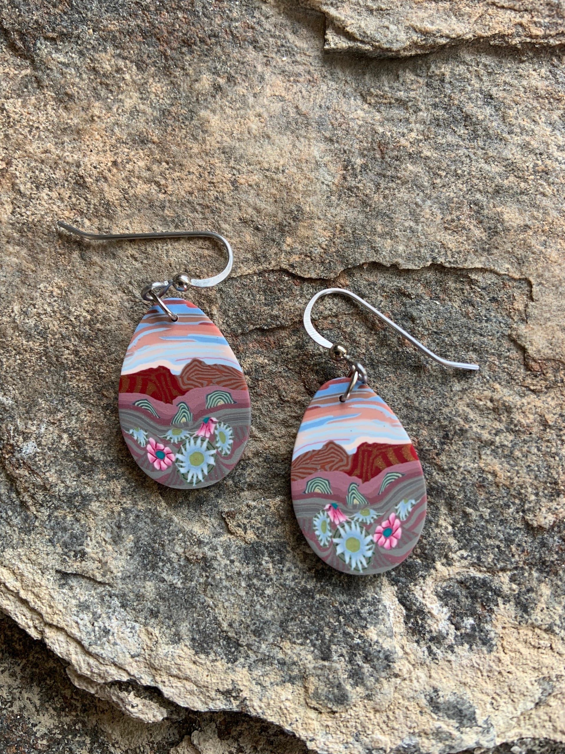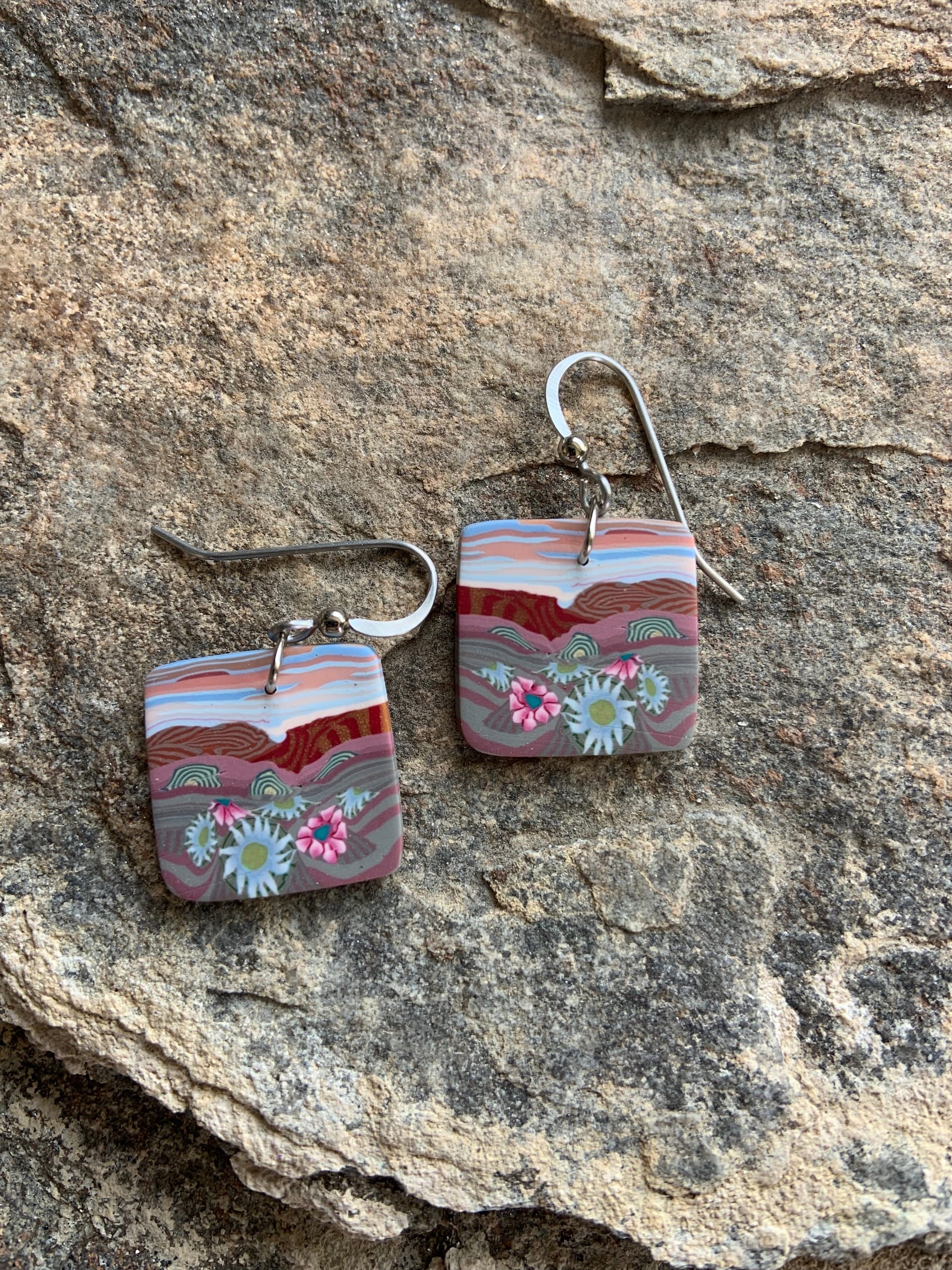 Each design of our polymer clay jewelry is created using a layering technique called canework. This process involves working three-dimensionally to produce a small brick or "loaf" which is then sliced revealing the image in the cross-section. Each slice is both an original and one of a series with variations that can differ slightly from the representative picture. All work is completely hand done by us.